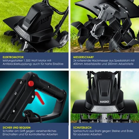 MASKO Bineuse avec moteur électrique pour la préparation du lit de semences 1 500 watts avec poignées ergonomiques et garde-boue en acier