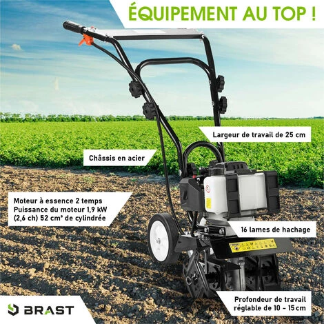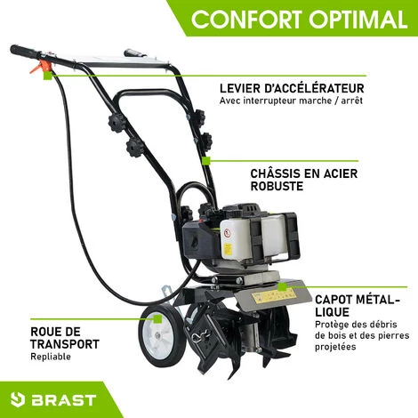 Notre motoculteur à essence BRAST AF 2500 combine puissance, maniabilité, efficacité et sécurité en un seul appareil et est donc est supérieur à de nombreux motobineuses électroniques: le moteur 2 temps d’une cylindrée de 52cc, qui développe jusqu’à 1,9 kW (2,6 Cv) maximum, est extrêmement puissant et convient donc parfaitement aux petites surfaces et aux lits courbes