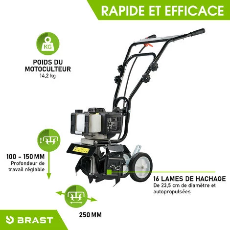 - Grâce à sa profondeur de travail réglable de 100 à 115 mm et à sa largeur de travail de 250 mm, notre motobineuse BRAST est supérieure à de nombreuses petites houes en termes de vitesse et d’efficacité.